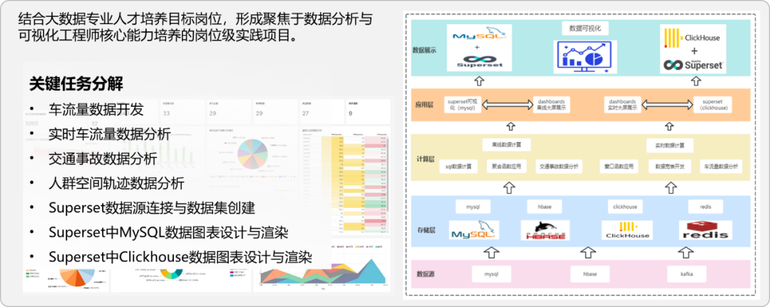 交通大数据分析与可视化实践包括车流量数据开发、实时车流量数据分析、交通事故数据分析、人群空间轨迹数据分析、数据源连接与数据集创建、MySQL数据图表设计与渲染、clickhouseL数据图表设计与渲染七个实践模块,涵盖了数据整合与关联、MySQL 数据关联分析、Flink 实时流处理与窗口函数、ClickHouse 数据存储、Python 数据分析和Superset 数据可视化展示等相关技术。