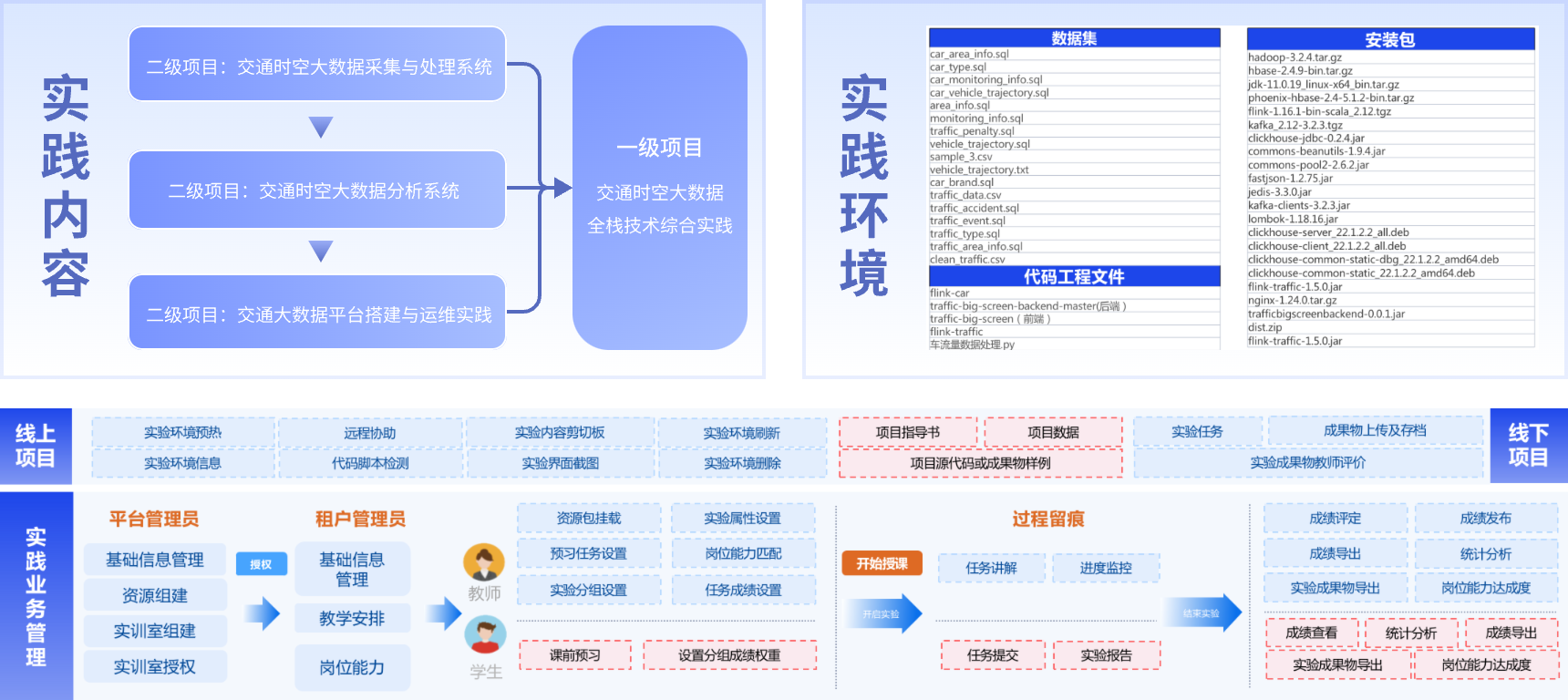实训室的实践任务和内容设计基于交通领域大数据技术人才的典型工作任务和职业技术能力要求;实训室平台可以为每个实践任务定义知识技能点,并根据实践任务的完成情况给予知识技能点、职业技术能力和岗位能力达成度等相关数据分析和可视化展现报告。